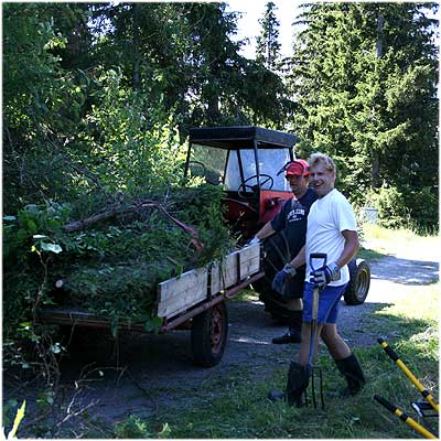 | Comment | Traktorföraren Henrik Simm och hans glade granne Thomas Lindén har lastat upp kvistar och sly efter att ha rensat vägrenen på väg mot Bybacka. |