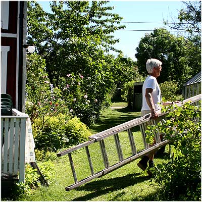| Comment | Nyinflyttade Jonas Wersäll bär tillbaka den långa stegen och hämtar andra redskap för att fortsätta arbetet. |