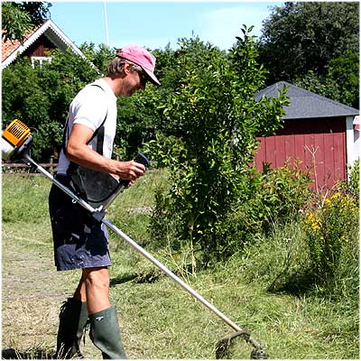 | Comment | Bakom solglasögon och skyddande keps jobbar Johan Strömsäter med sin röjsåg för att ta bort det långa gräset vid postkuren. |