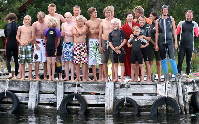 | Comment | I gruppen, som som innan starten tittar ut över vattnet mot Måsberg, kommer fem personer att tävlingssimma. De är från vänster: Noah Våge, bröderna Gabbe och Oscar Strömsäter samt Fredrik Olsén. Dessutom Mikael Ahlqvist (längst till höger). |