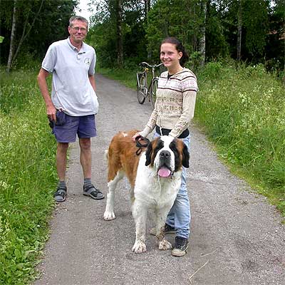 | Comment | Natalie från Snickargården är på promenad med Båtsman. Magnus Almgren lämnar sin cykel direkt för att hälsa. |
